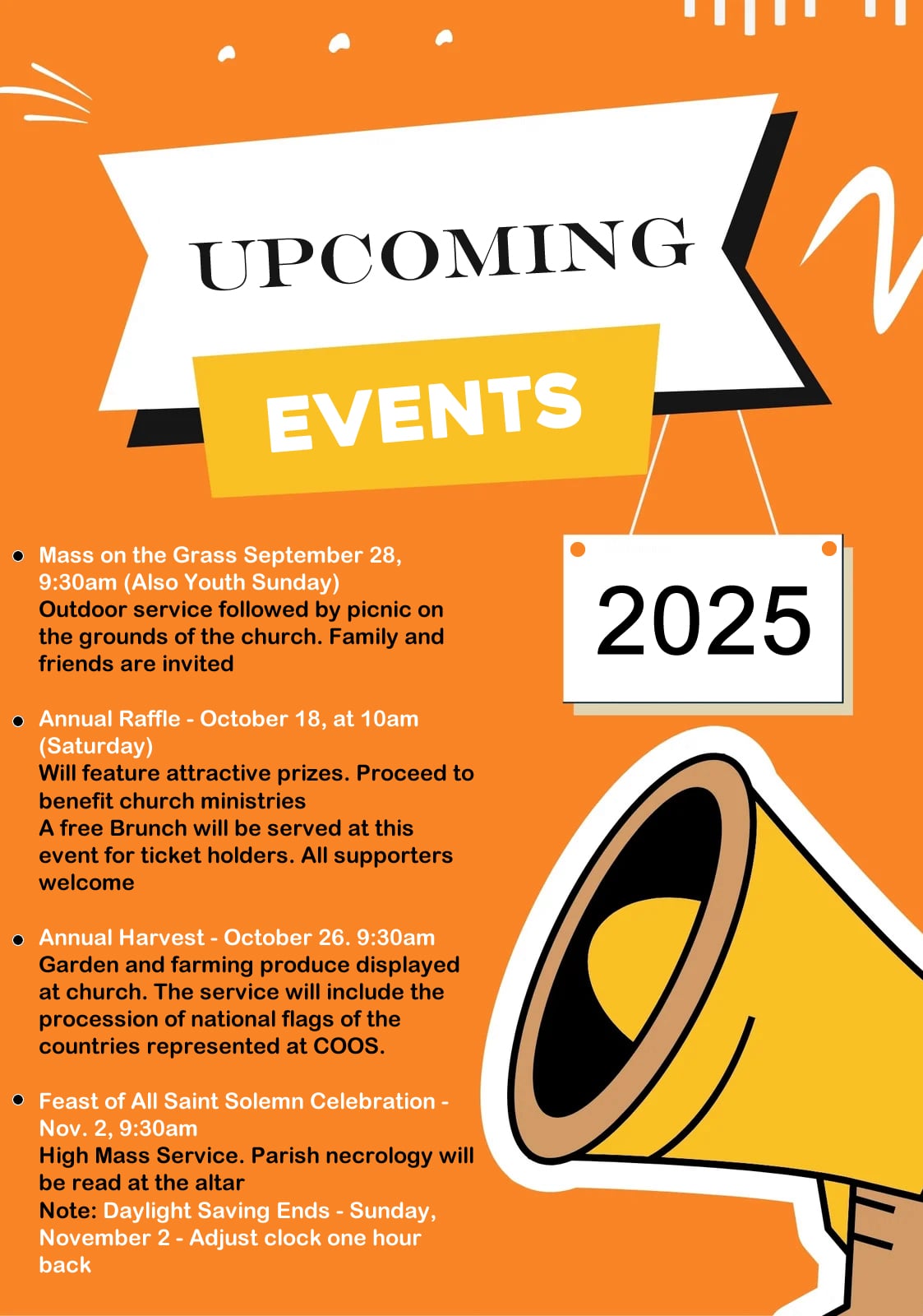 Outdoor service followed by picnic on the grounds of the church. Family and friends are invited
